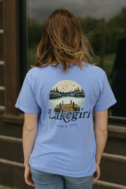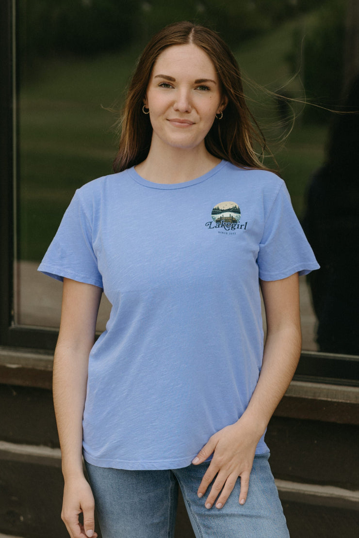 Lakegirl Web Exclusive! The Dyed Slub Tee in Peri features a left chest and full back screen print with a peaceful lakeside scene. This cool-toned violet-blue tee is made from soft, pre-shrunk cotton with a slub texture for extra comfort and an easygoing feel—perfect for sunny lake days.