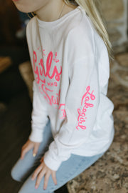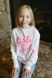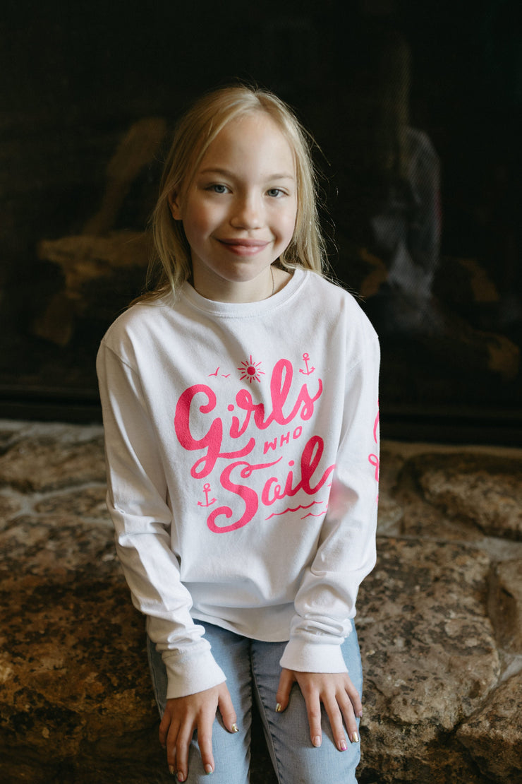 Web Exclusive! Made for the girls who chase sunshine and set sail, this white long sleeve tee features a bold pink Girls Who Sail graphic with anchor and sun details. Crafted from soft ringspun cotton with a relaxed fit, it's the perfect layering piece for cool mornings at the lake.