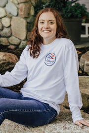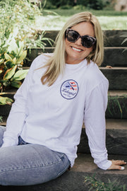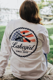 The perfect addition to your patriotic lakegirl look this summer! Features a left chest and full back screen print design on a white ringspun long sleeve.