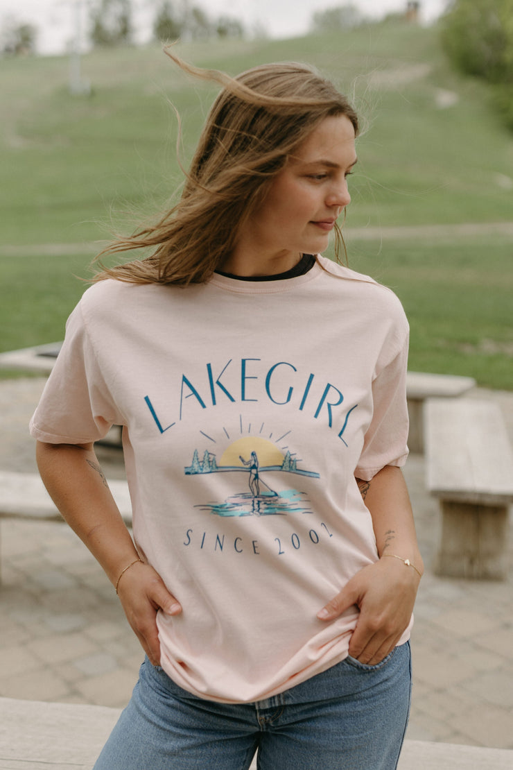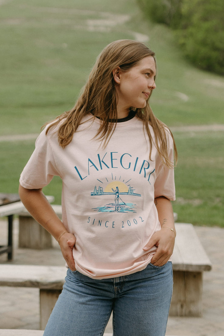 Lakegirl Web Exclusive! This Shell Pink Ringspun Tee brings soft color and relaxed lake energy together in one easy style. It features a full front screen print of a paddleboarder silhouette with “Lakegirl Since 2002” artwork. Made from 100% cotton with a relaxed fit that runs roomy, it’s the go-to tee for sunny dock days or cozy coffee runs.
